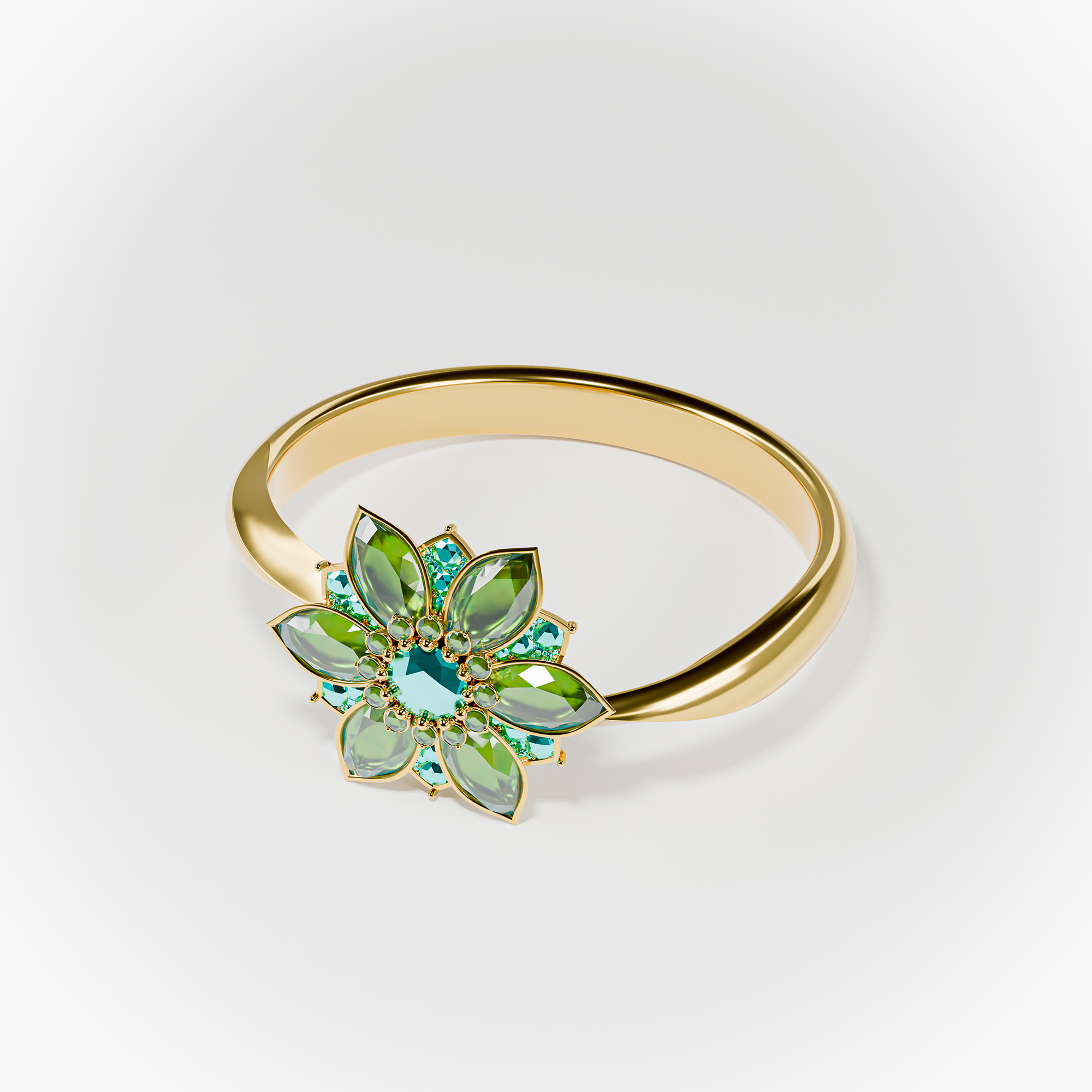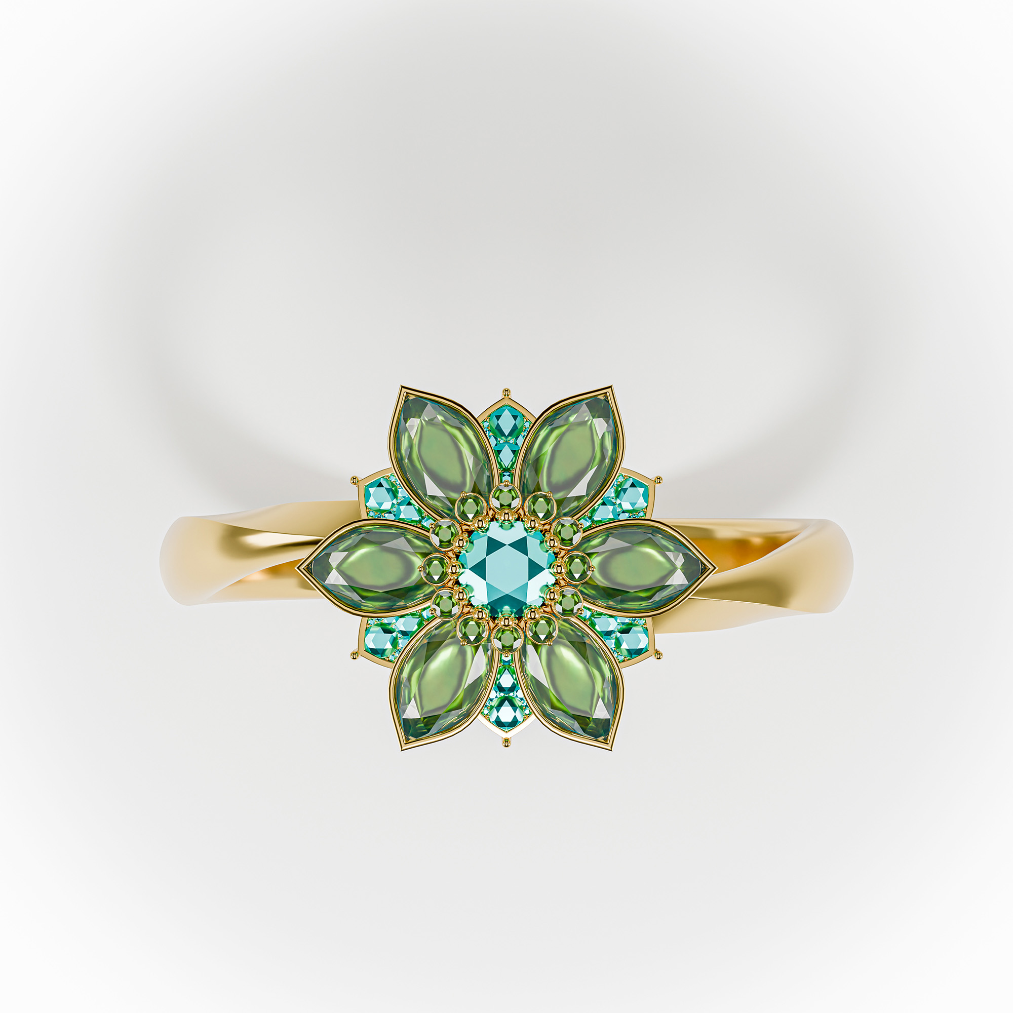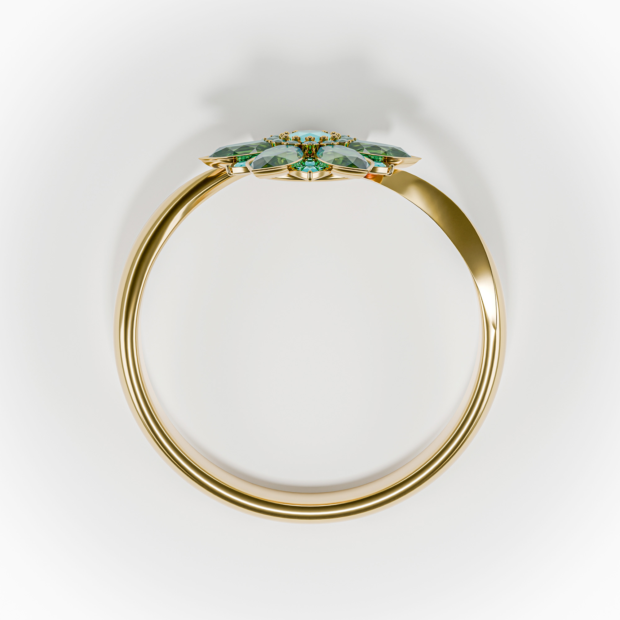 Perspective view of a high-end gold ring featuring emerald-green gemstone petals.